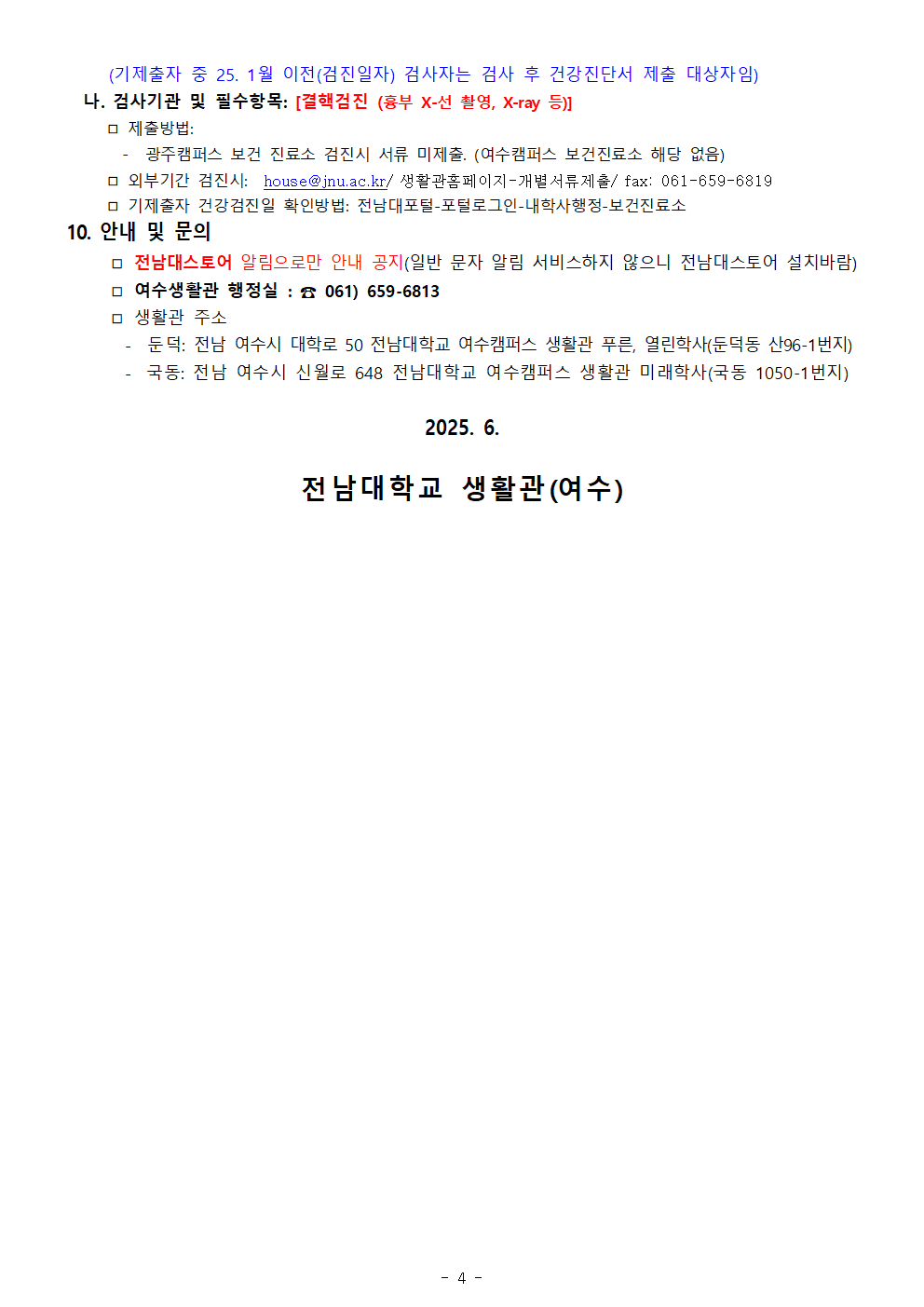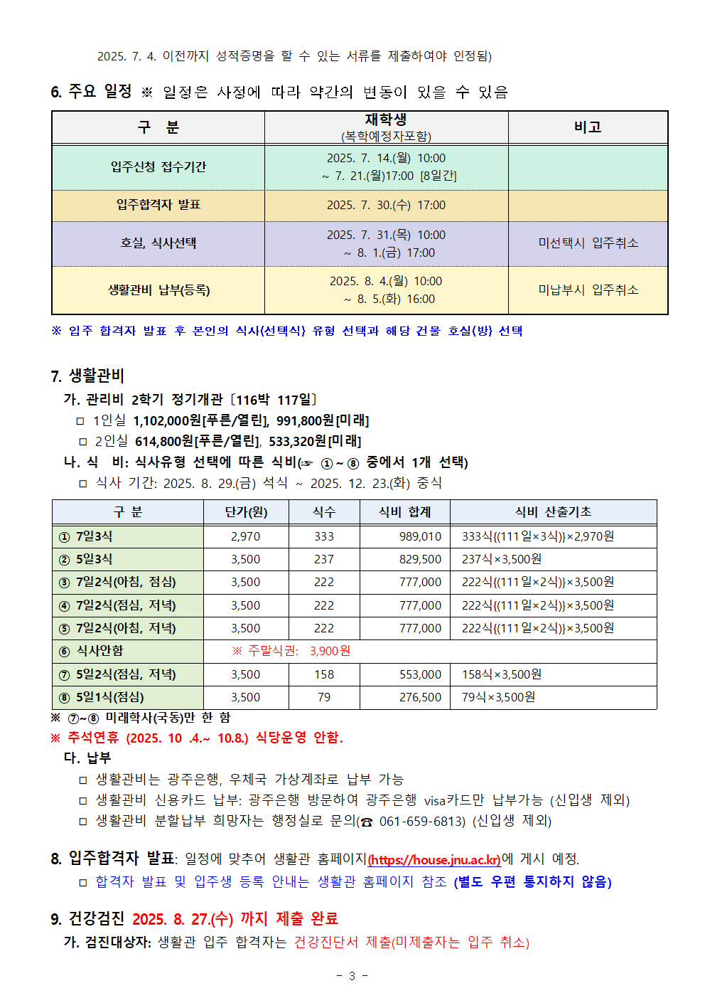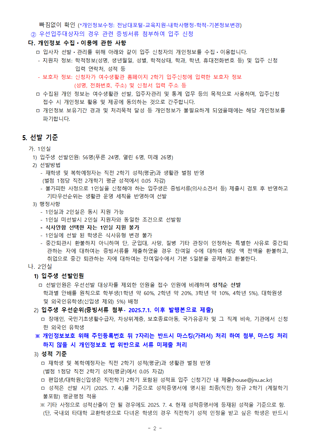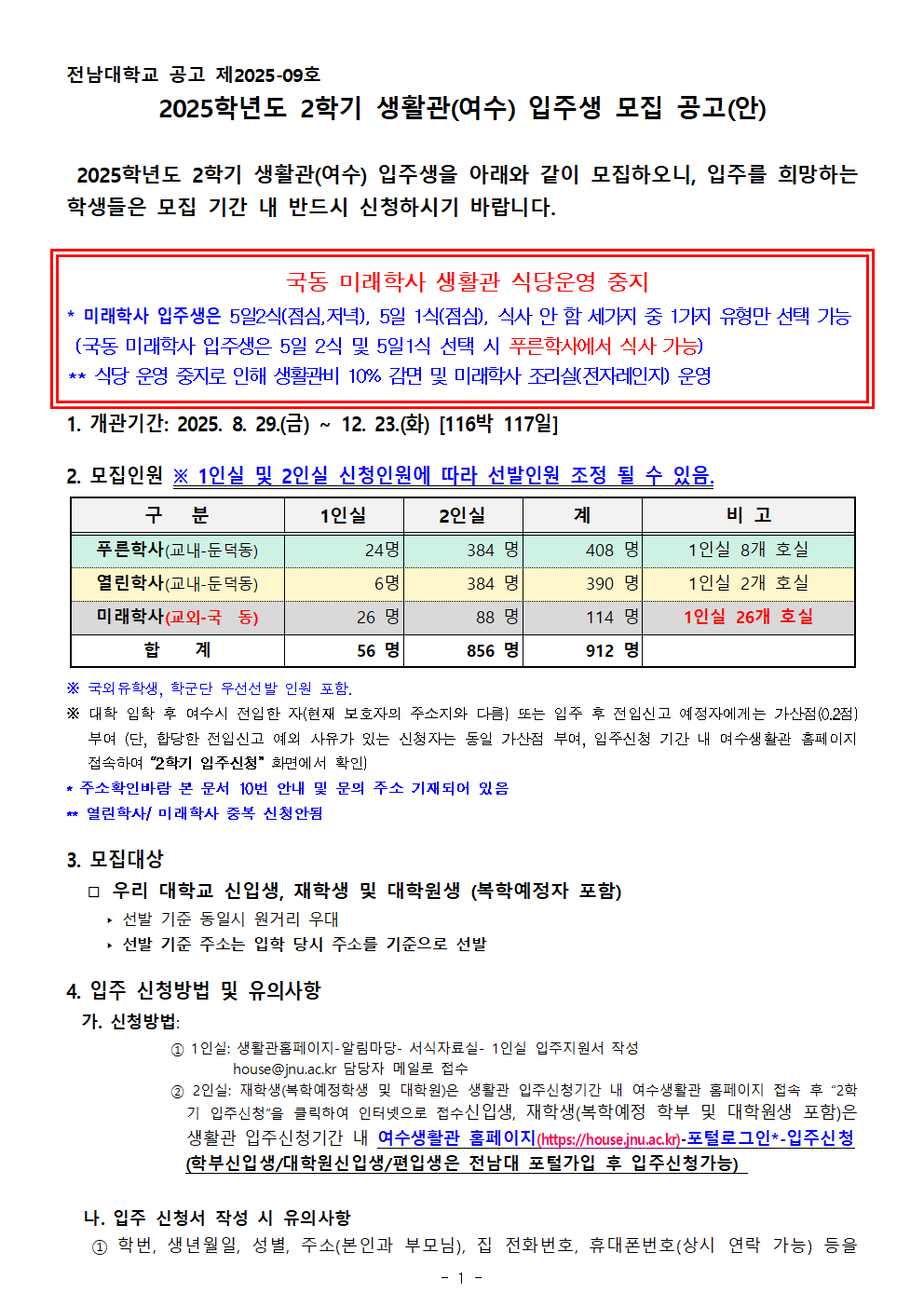 2025학년도 2학기 생활관(여수) 입주생 모집 공고(안)